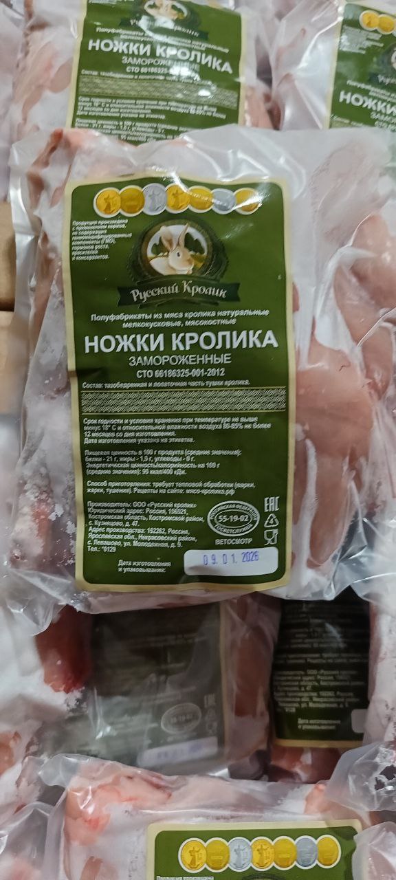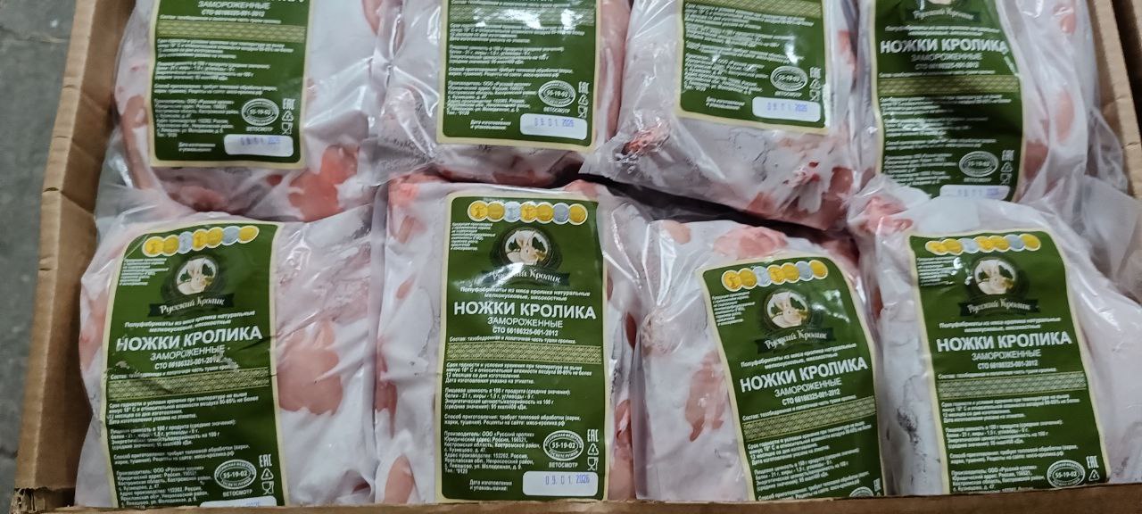 Мясо этого животного высоко ценится гурманами. Оно отличается особой нежностью и неповторимым вкусом, используется для приготовления разнообразных блюд: пасты, супов, отбивных, салатов. Продукт считается диетическим, поскольку содержит большое количество животного белка и минимум липидов. В замороженном состоянии ножки кролика могут храниться до 1 года. Для практичности они фасуются в картонные коробы, которые защищают их во время транспортировки.